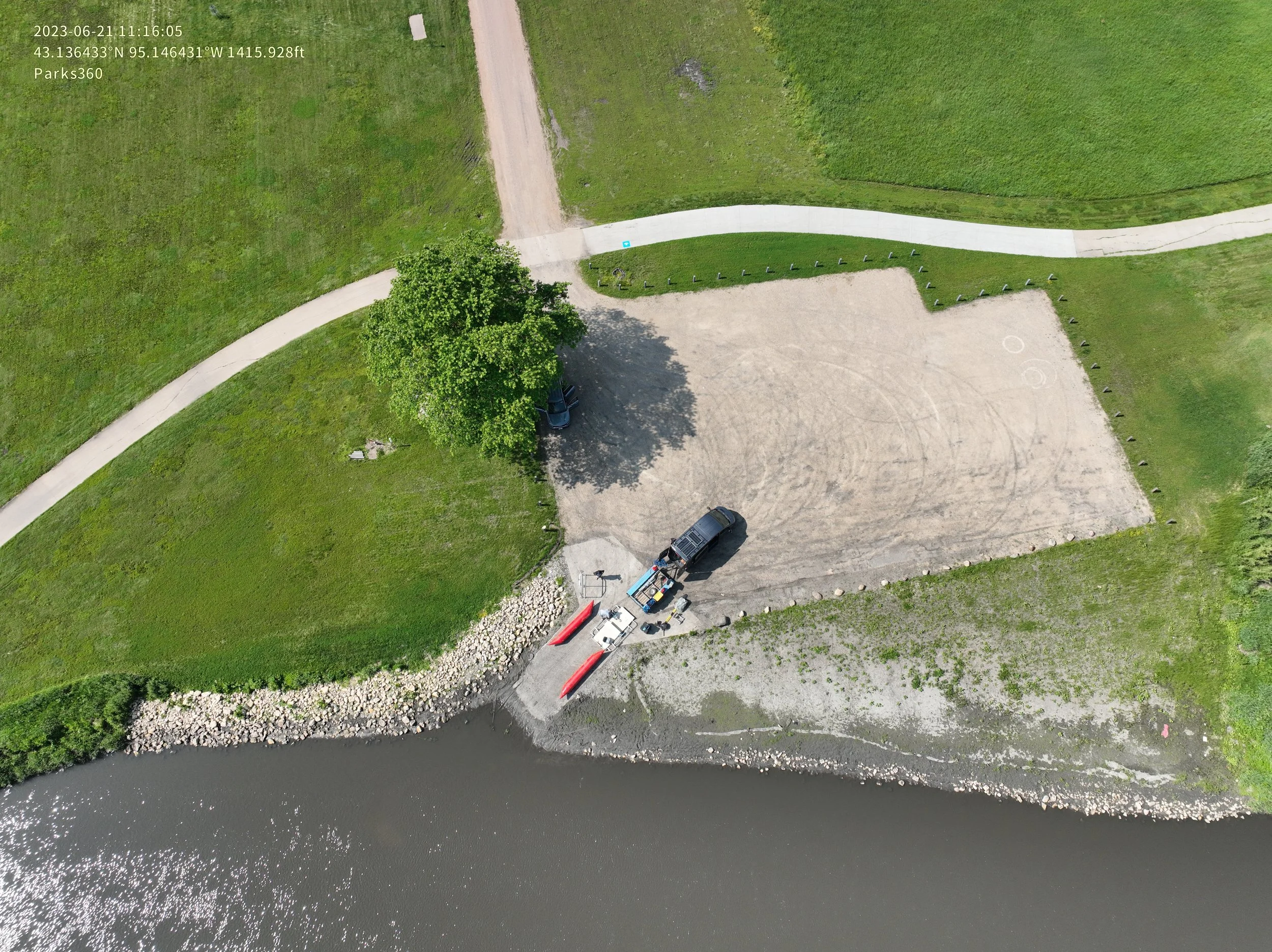 This access features a grooved concrete boat ramp from the riverbank to riverbed and a large parking area.