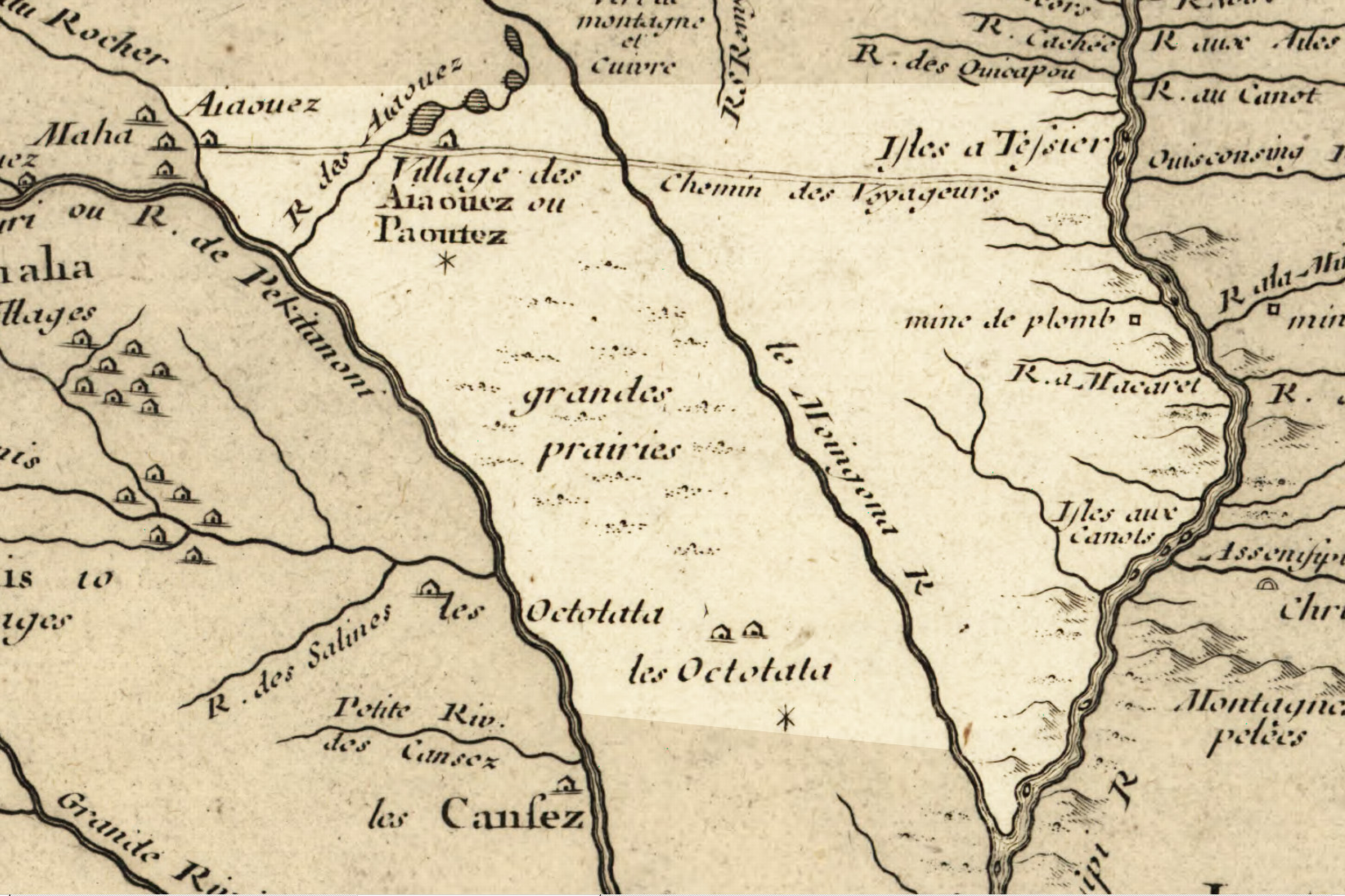 By the early 1700s, French explorers and fur traders (voyageurs) mapped the region and used long-established Native trails for travel and commerce. The 1702 Delisle Map and the 1718 Chemin des Voyageurs (“Path of the Voyageurs”) recorded routes linking the Mississippi to the Missouri River.