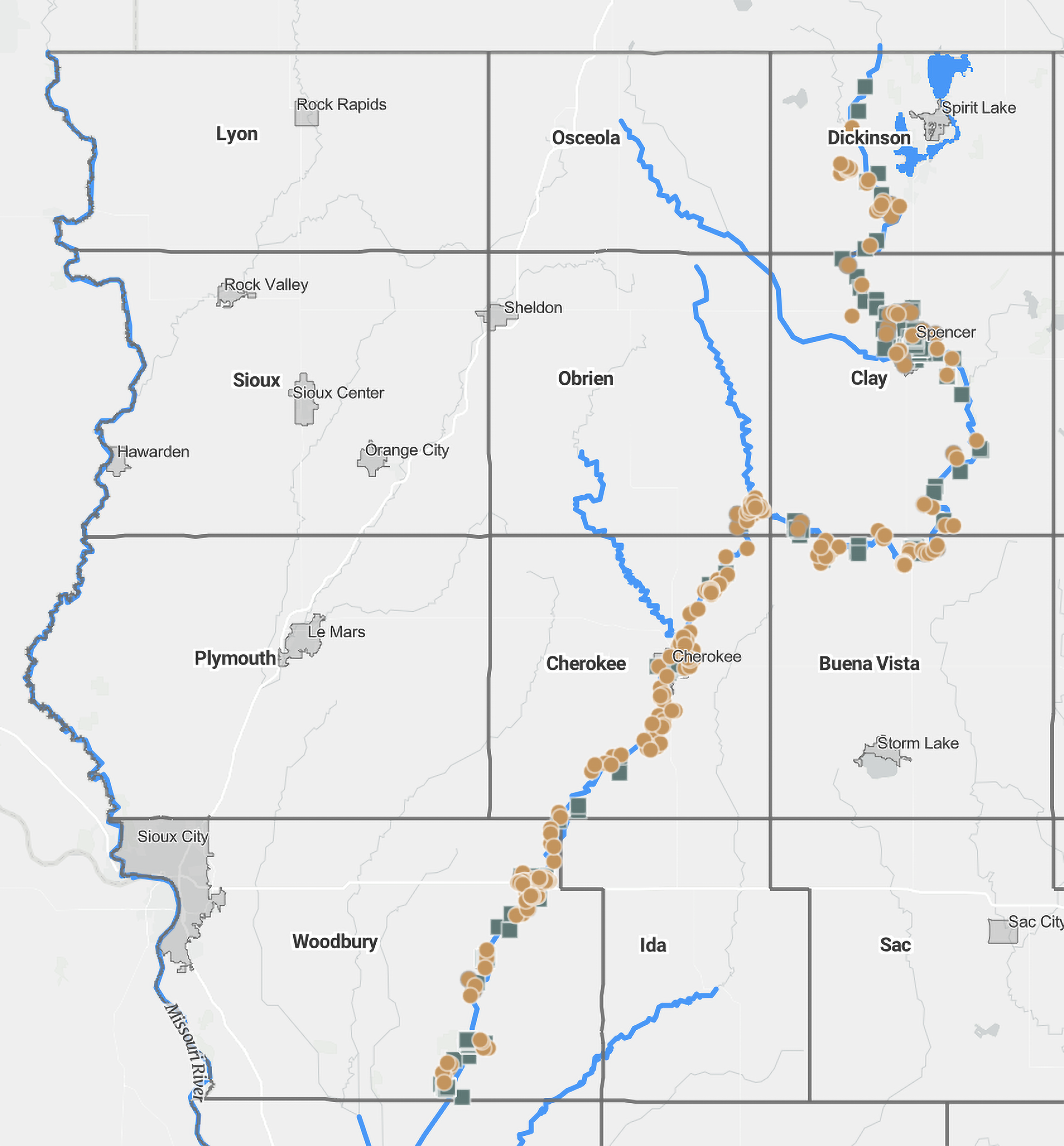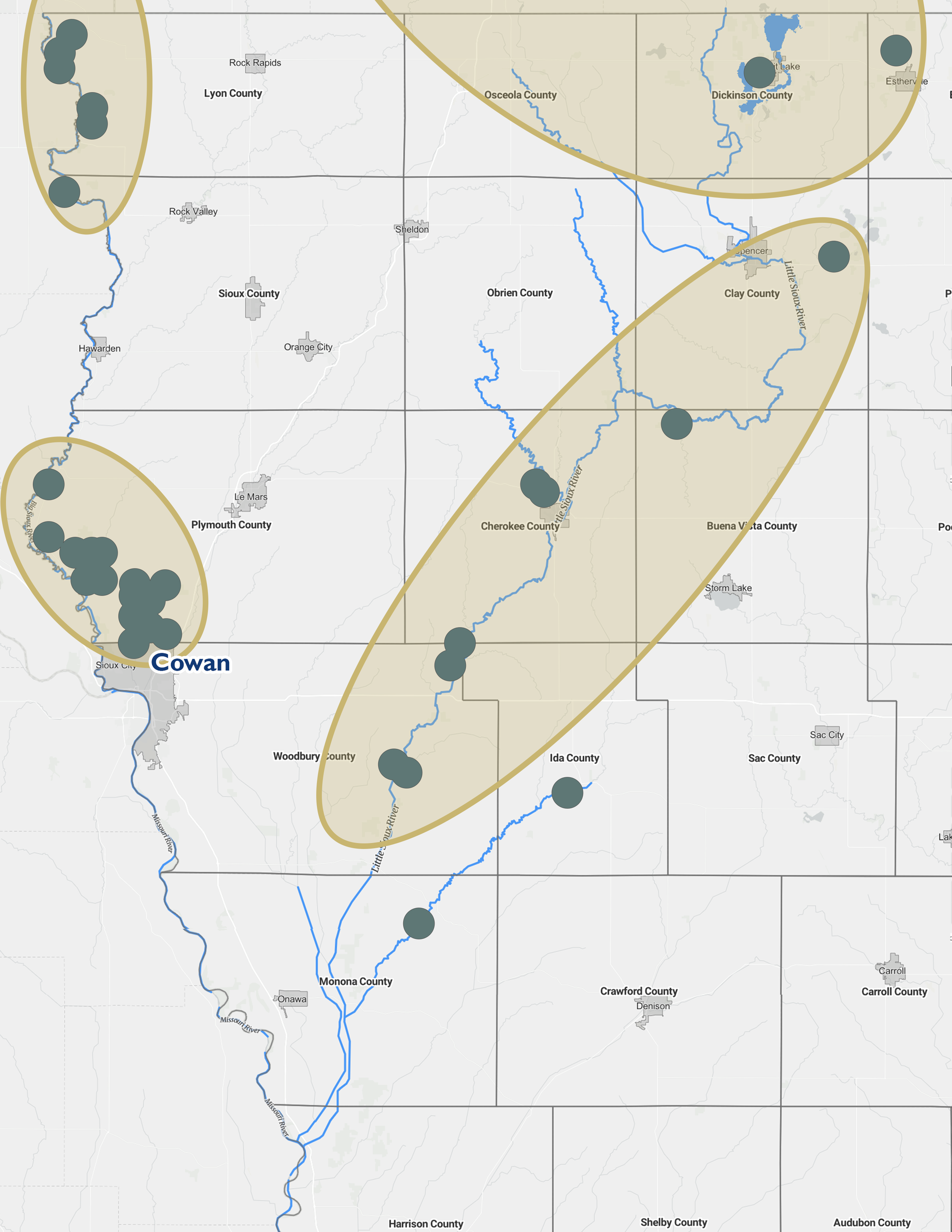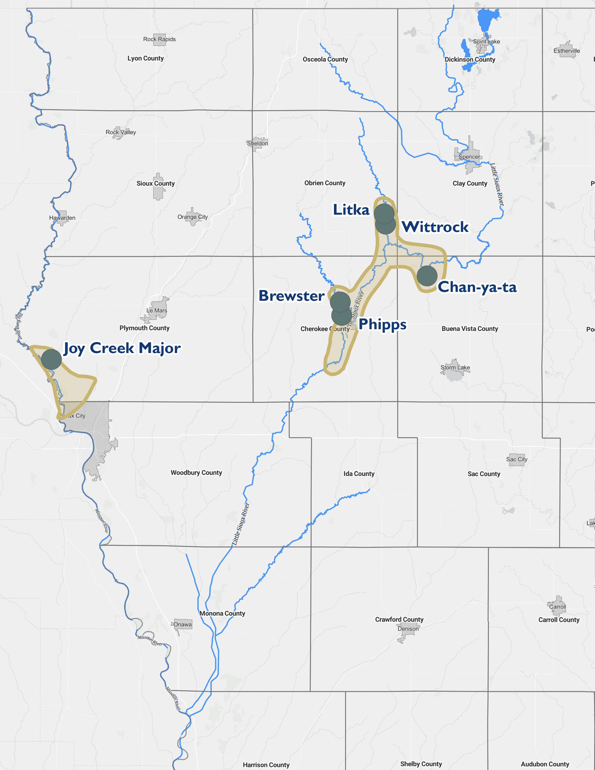 A map of Great Oasis sites in Northwest Iowa.