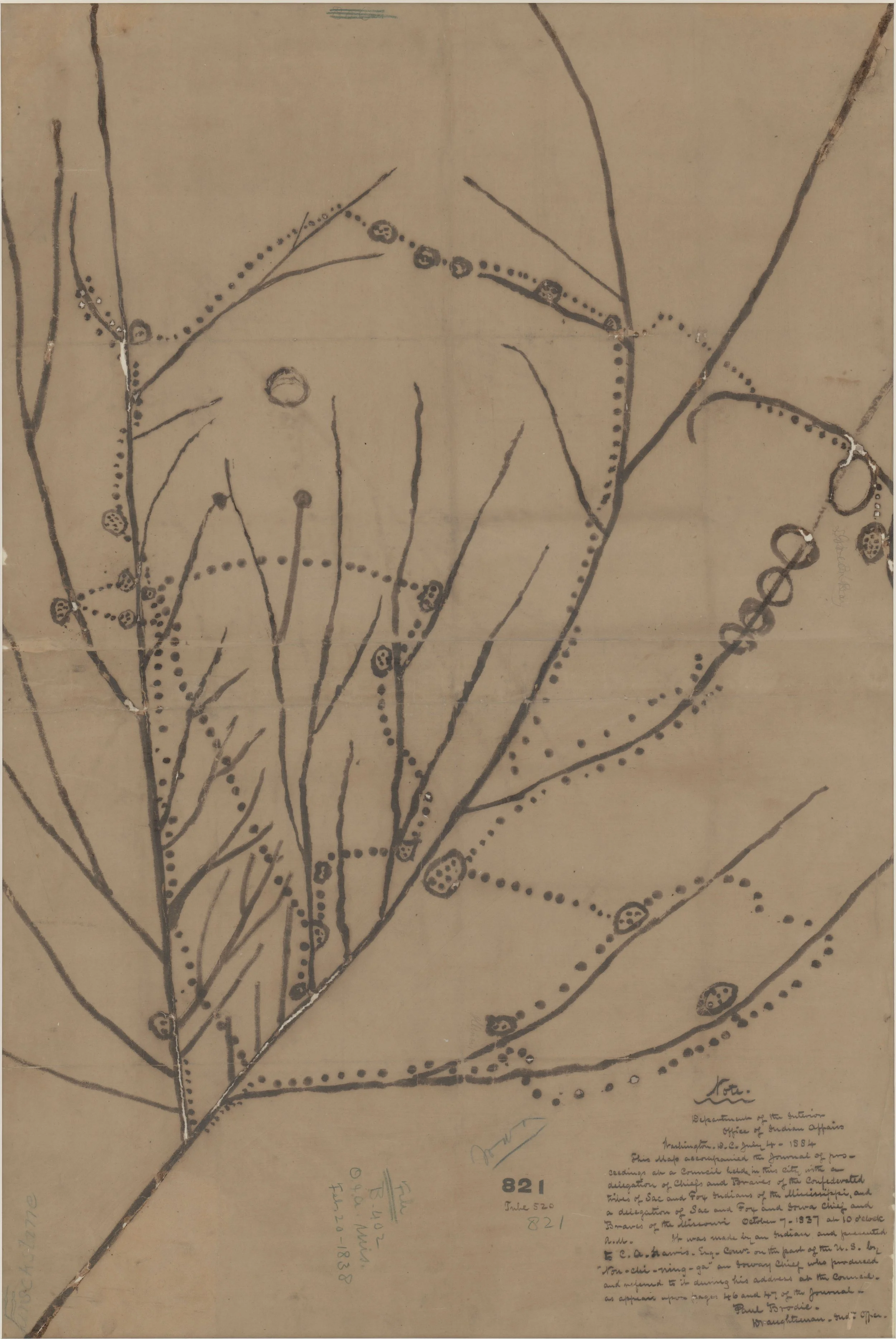In 1837, a delegation of Báxoǰe (Iowa) elders, led by Nahje Niŋe (No Heart of Fear), traveled to Washington D.C. to present a map of their ancestral homelands to government officials. This map is remarkable because it is the only non-European or non-American map made of Iowa in the 1800s, and it represents the history of the Báxoǰe from the time of their creation to 1837. This invaluable historical document resides at the National Archives in Washington D.C. The map, drawn completely from memory, shows the network of rivers in the Mississippi and Missouri drainages and identifies trails, villages, and other significant places. The Báxoǰe map encompasses more than 300,000 square miles between Lake Michigan and the Missouri River valley, centered on what we now call Iowa, and emphasizes the importance of rivers for transportation and travel for Native peoples. The map’s dashed lines represent trails, many of which can be correlated with trails mapped by explorers in the 1700s and early 1800s. It also shows 24 villages, about 10 of which can be identified archaeologically.