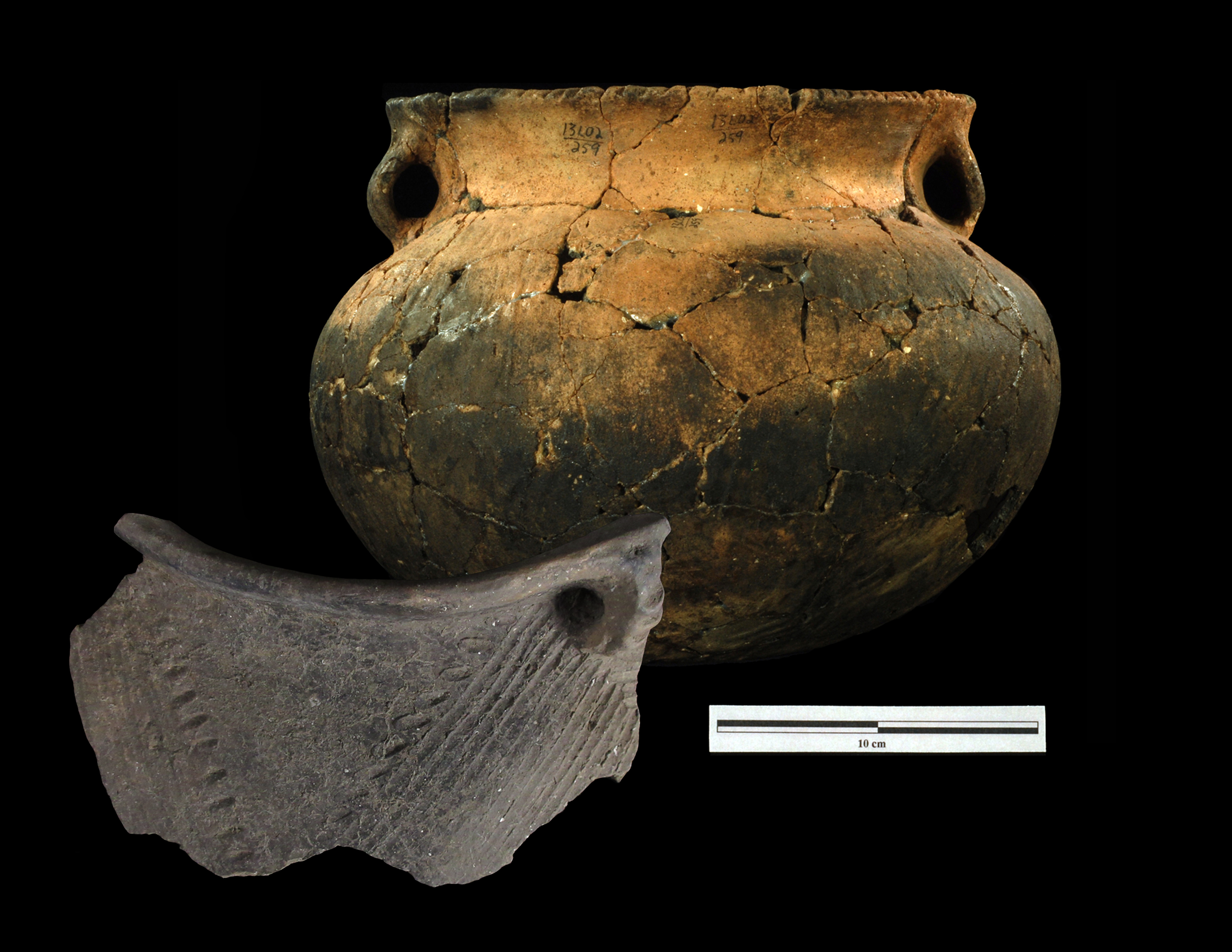 Great Oasis ceramics are distinctive globular-shaped (round) pots with rounded bases, high rims, and grit (sand or crushed rock) mixed into the clay for tempering.