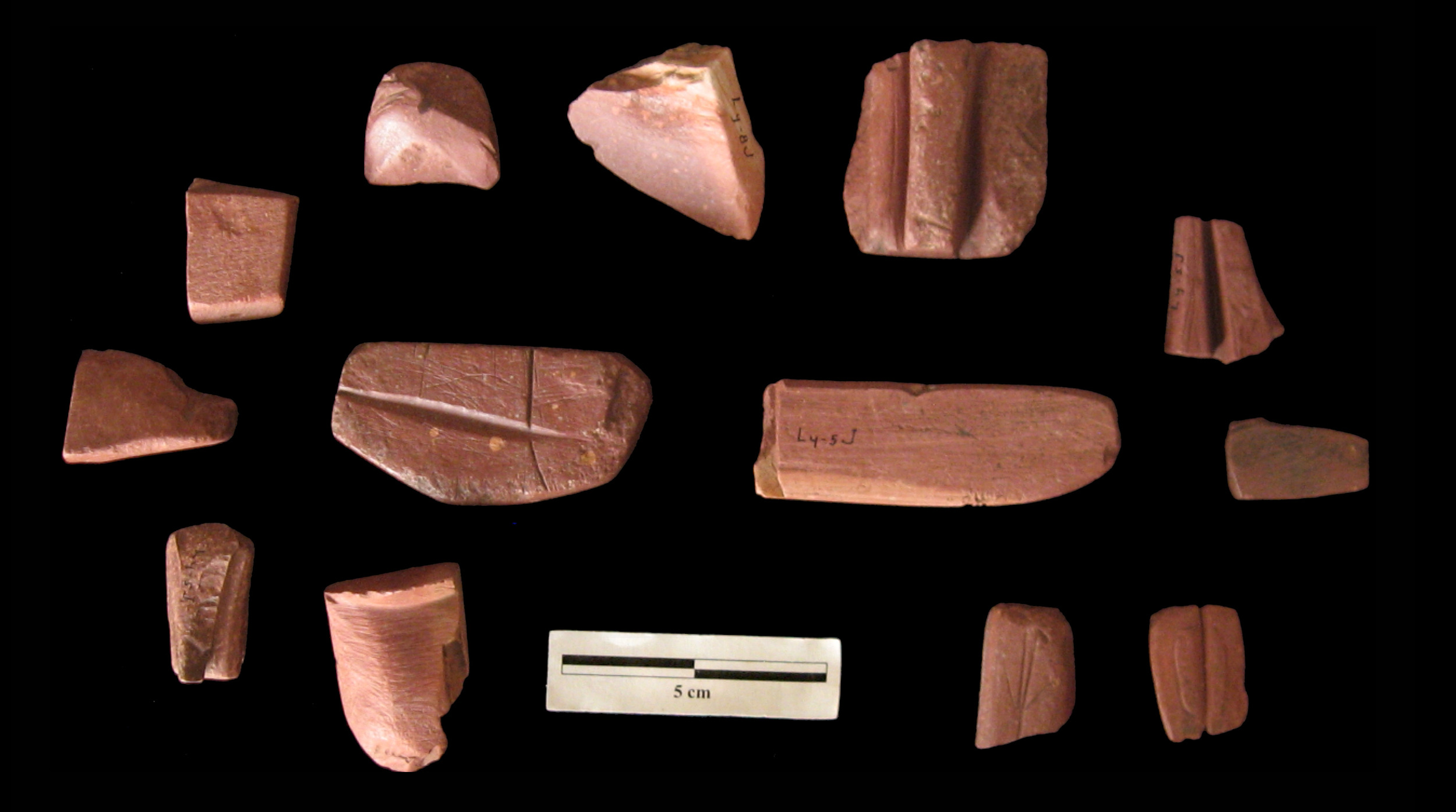 Red pipestone or Catlinite is a type of claystone or metamorphosed mudstone. This soft stone was worked into pipes and small plaques or tablets that were likely used in religious or ceremonial occasions. Because these pipes and tablets are still considered sacred objects, museums are shifting to displaying of replicas and illustrations, and many items are being repatriated.