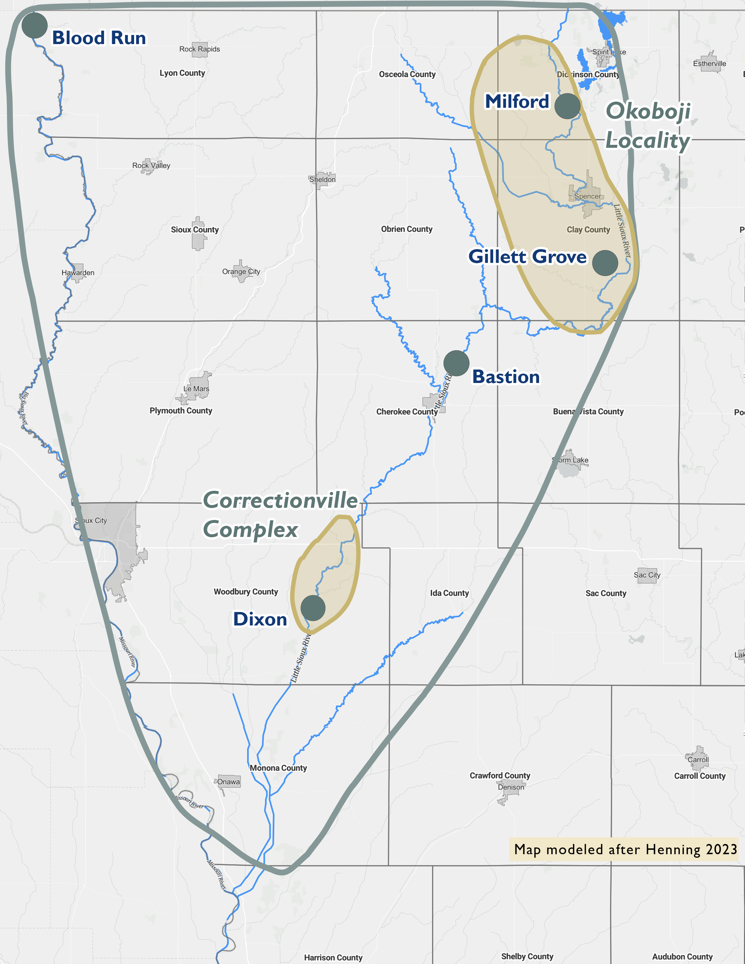 A map of Oneota sites in Northwest Iowa.
