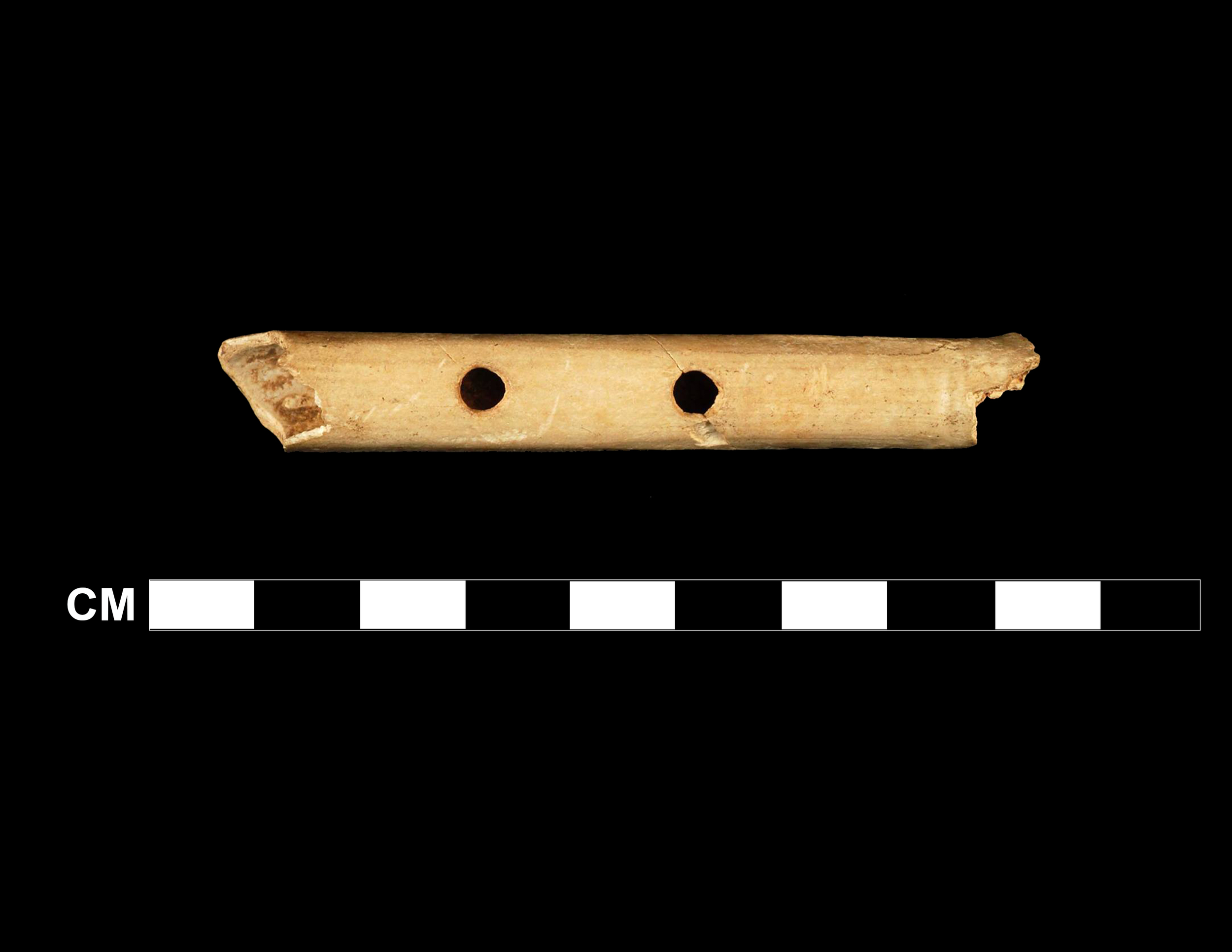 A flute made from the wing bone of a swan, found at the Cherokee Sewer Site (13CK405). Believed to be the oldest musical instrument found in the United States.