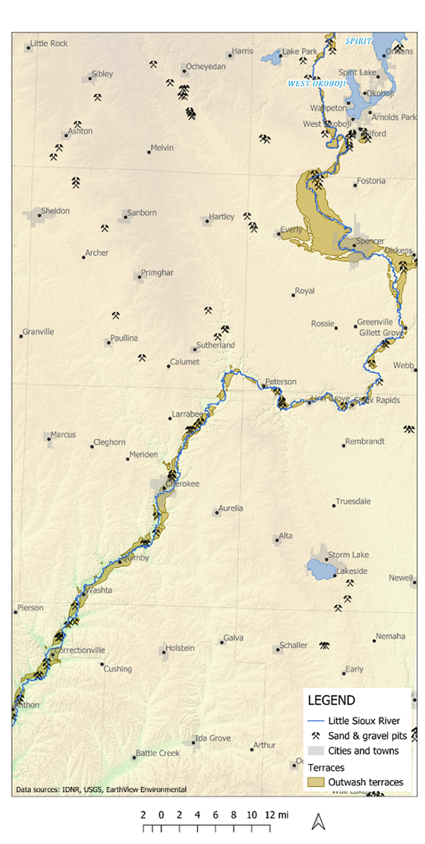 The Little Sioux River valley provides vital natural resources, including sand, gravel, and groundwater. Sand and gravel—key ingredients in concrete and asphalt—are heavily mined across Iowa, with the best deposits found in well-sorted river sediments. To reduce environmental impacts, most mining occurs on high river terraces rather than directly beside the river, with visible stockpiles between Sioux Rapids and Correctionville.
