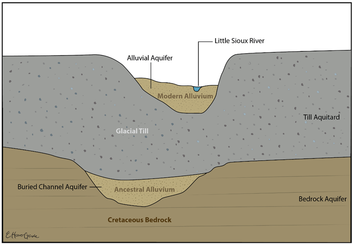 During the Pleistocene Ice Age, glaciers buried this ancient landscape under hundreds of feet of till, filling old river valleys with sediment. Although hidden today, these ancient valleys are traced through deep well records. The modern Little Sioux River partly follows two of these buried channels—the Fremont and Anthon valleys—before reaching the Missouri River.