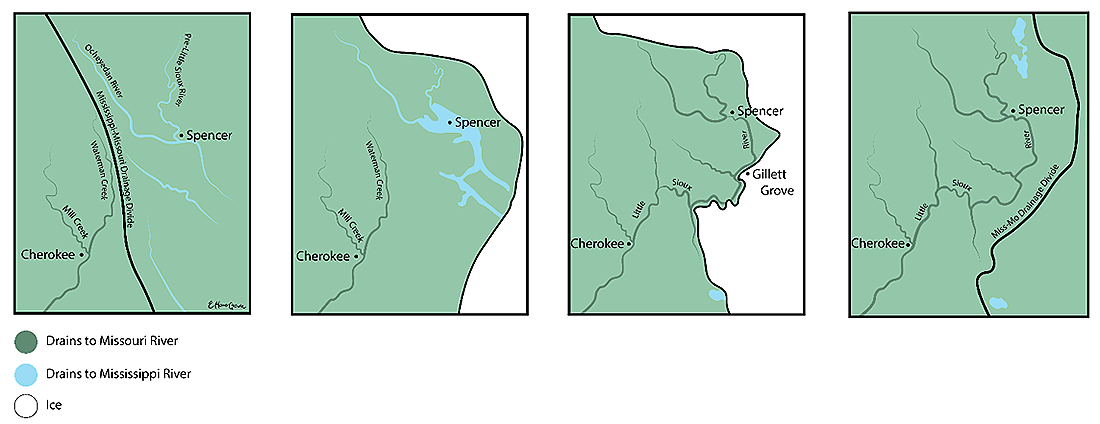 One major event occurred when the Des Moines Lobe advanced around the end of the Pleistocene. The ice blocked the upper Little Sioux River near Gillett Grove, forming a temporary Glacial Lake Spencer. When the lake overflowed, it cut a new channel westward, joining Waterman Creek and permanently establishing the river’s modern course.