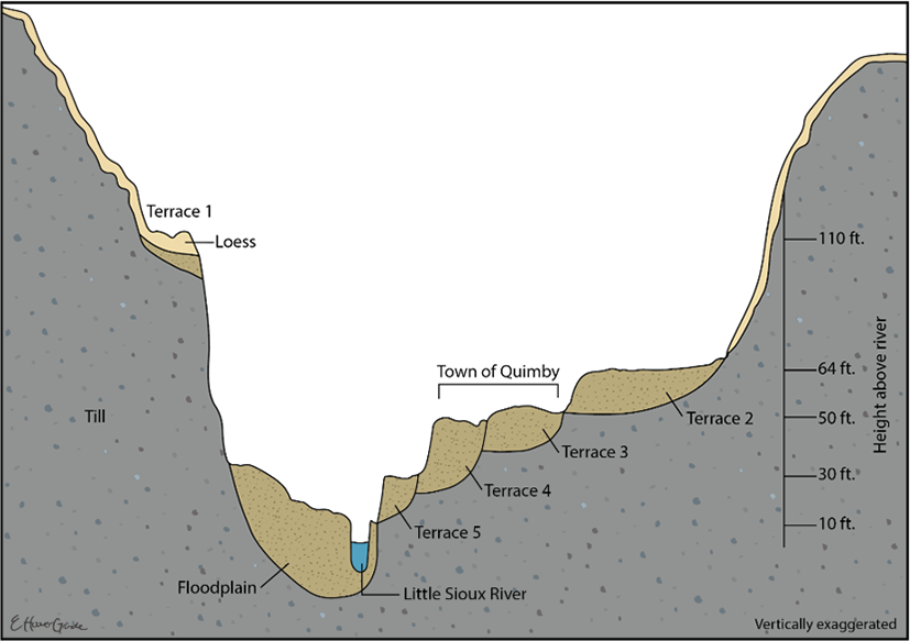 The Little Sioux River flows through terrain molded by three major glacial episodes — the Pre-Illinoian, Middle Wisconsinan, and Late Wisconsinan — arranged from oldest in the south and west to youngest in the north: