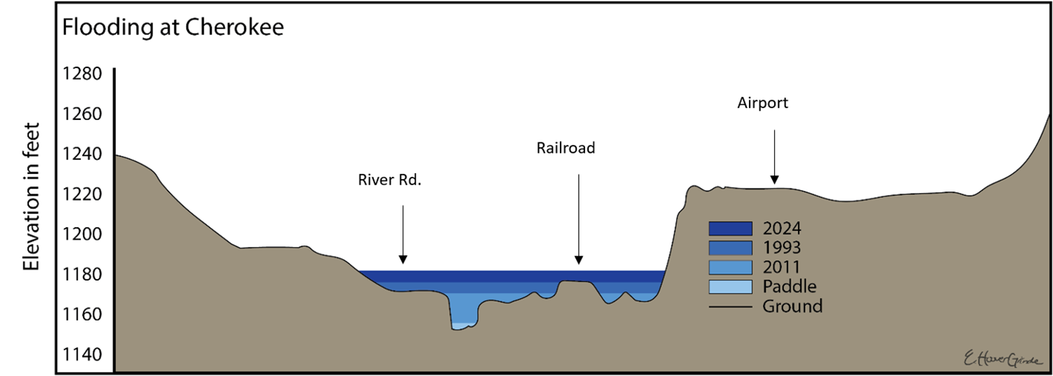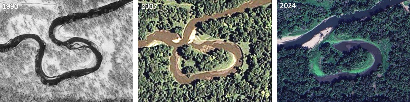 As meanders expand, they can form cutoffs, where the river carves a shorter path and leaves behind oxbow lakes. These oxbows—seen near Hawk Valley, Linn Grove, and Wanata Park—provide crucial wildlife habitat, floodwater storage, and water-quality benefits.