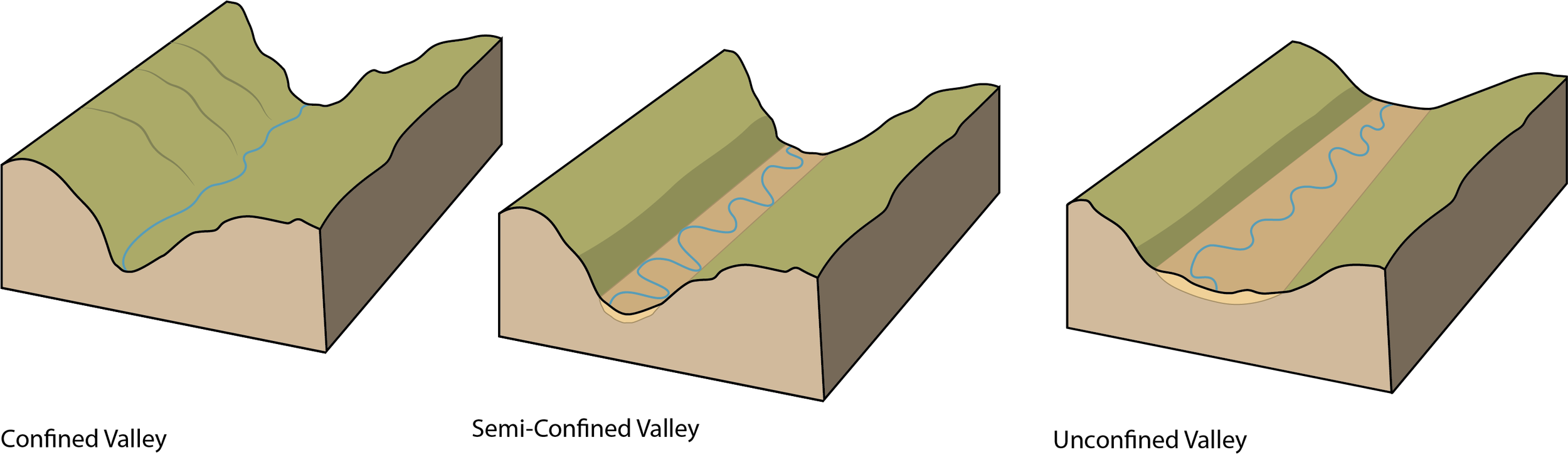 Semi-confined valleys (common along much of the Little Sioux) allow moderate shifting and create bluffs.