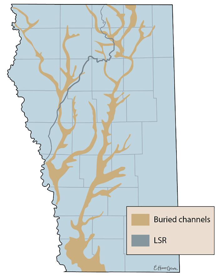 Buried channel aquifers lie between bedrock and glacial deposits, consisting of ancient river sediments shielded by impermeable glacial till.