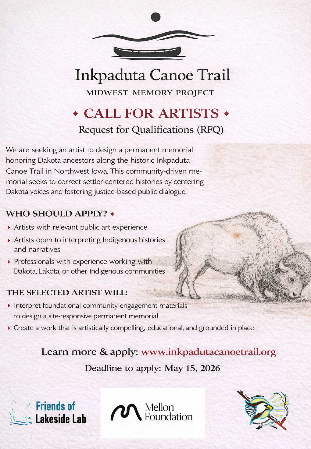 This Request for Qualifications (RFQ) is issued by the Inkpaduta Canoe Trail – Midwest Memory Grant Committee in coordination with the Flandreau Santee Sioux Tribe Tribal Historic Preservation Office (FSST–THPO) and project partners. The project is supported by funding from the Mellon Foundation through Forecast Public Art.