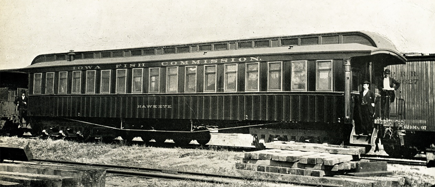 The ‘Hawkeye’ rail car was used to transport fish from the Mississippi backwaters to the Iowa Great Lakes and Little Sioux River in the late 19th and early 20th century.