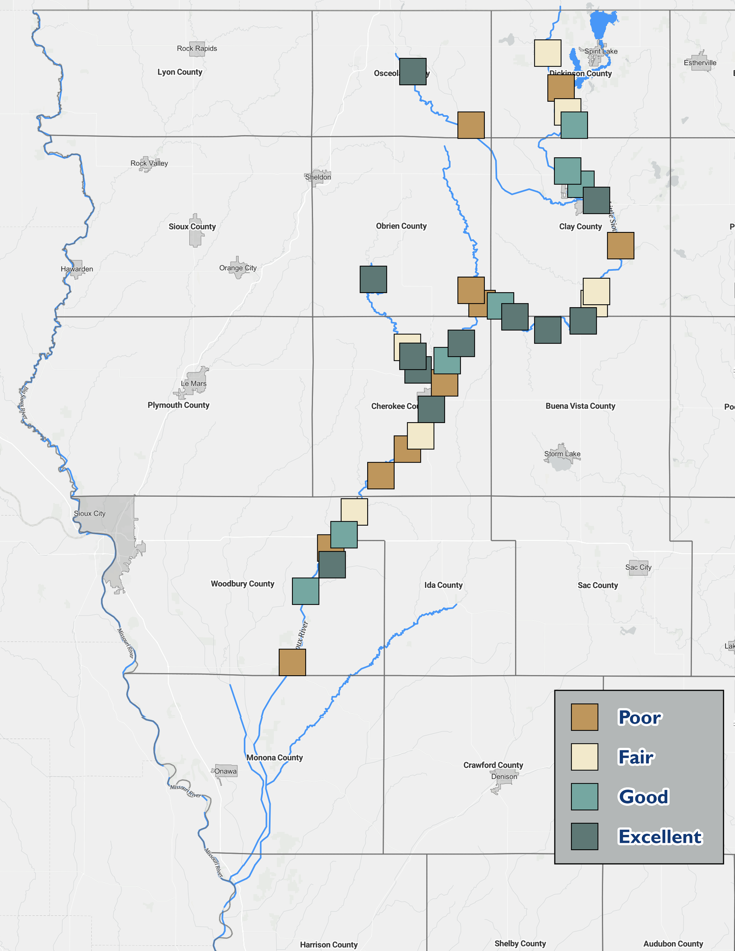 A map of Freshwater Mussel sampling efforts on the Little Sioux River.