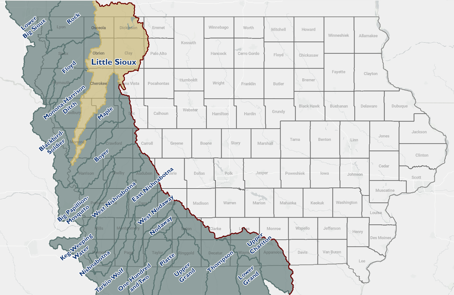 The Little Sioux watershed is highlighted in tan. The Mississippi - Missouri divide is marked in red.